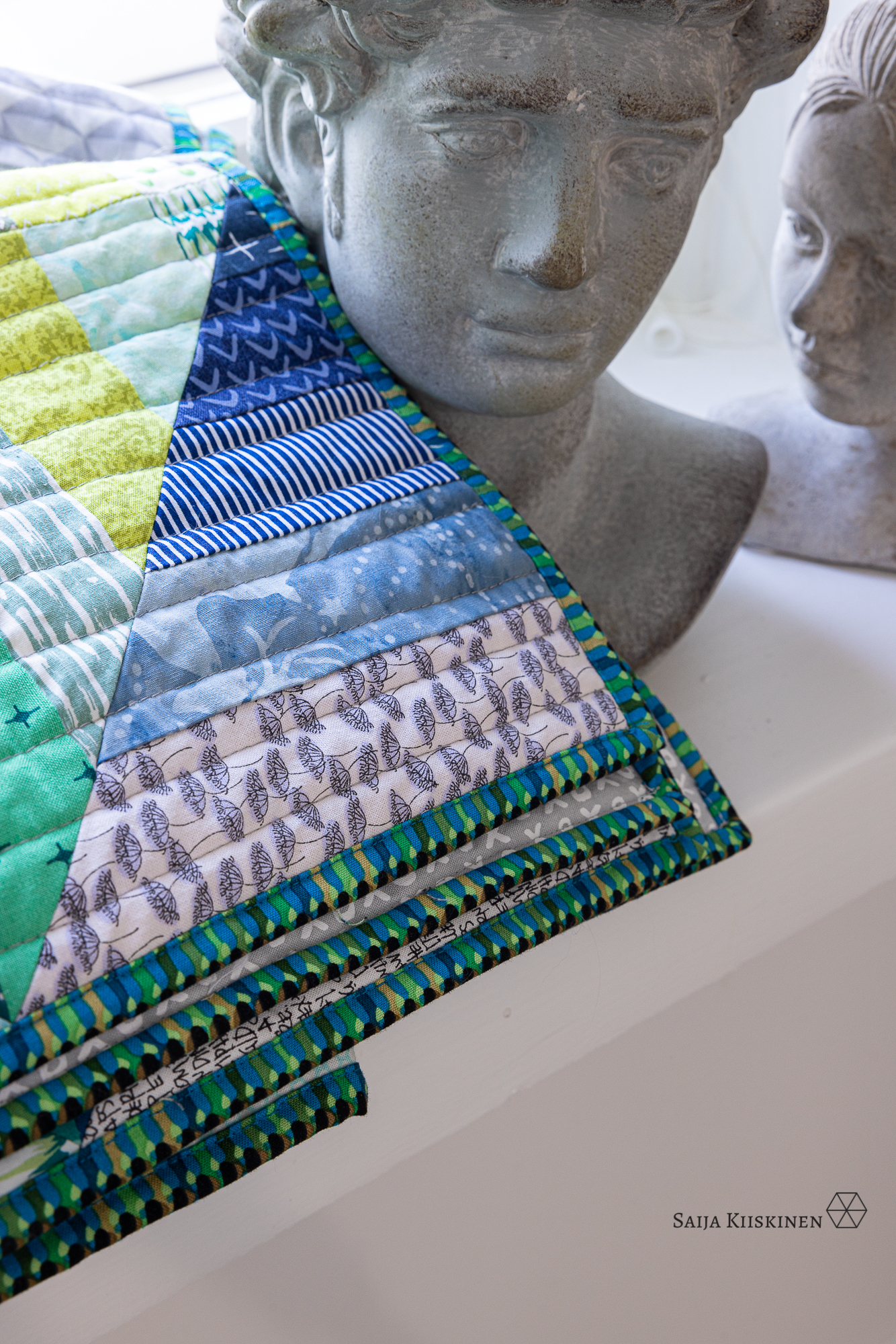 Kankaat ovat pääosin tilkkulaatikon sisältöä mutta joitain värejä olen täydentänyt isommista paloista.